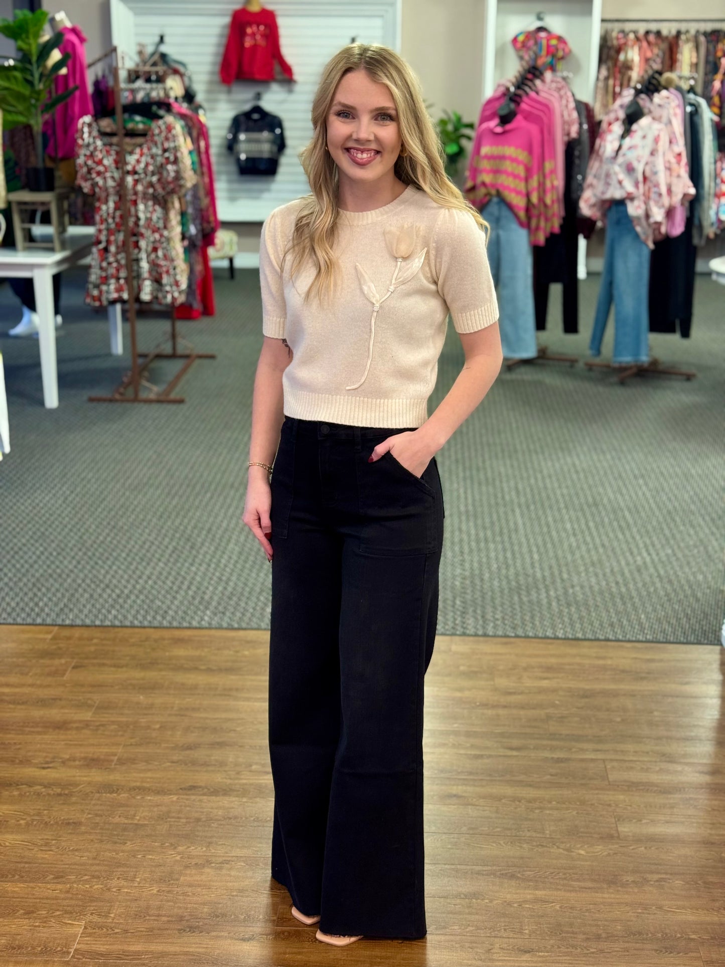 The star of the look is the delicate lily-inspired knot floral detail, artfully placed to add texture and elegance without overwhelming the design. Perfectly balanced between cozy and refined, this top pairs beautifully with denim, trousers or skirts for workdays, brunch or casual outing.